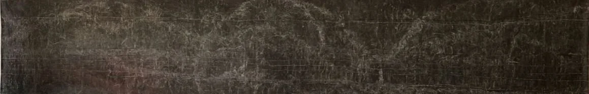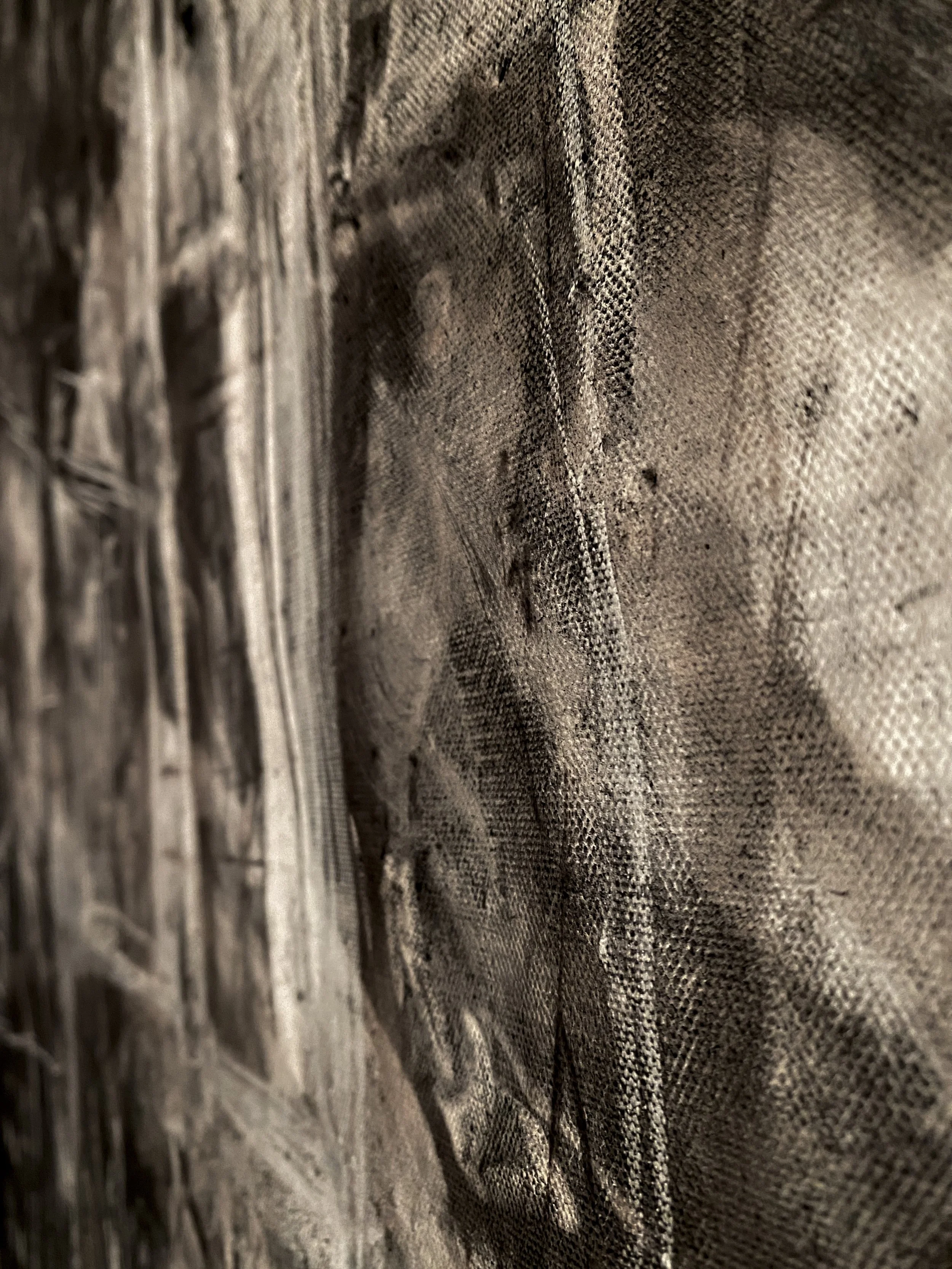 Charcoal, rust, brick dust, powdered marble, rice glue, and chalk on fabric.