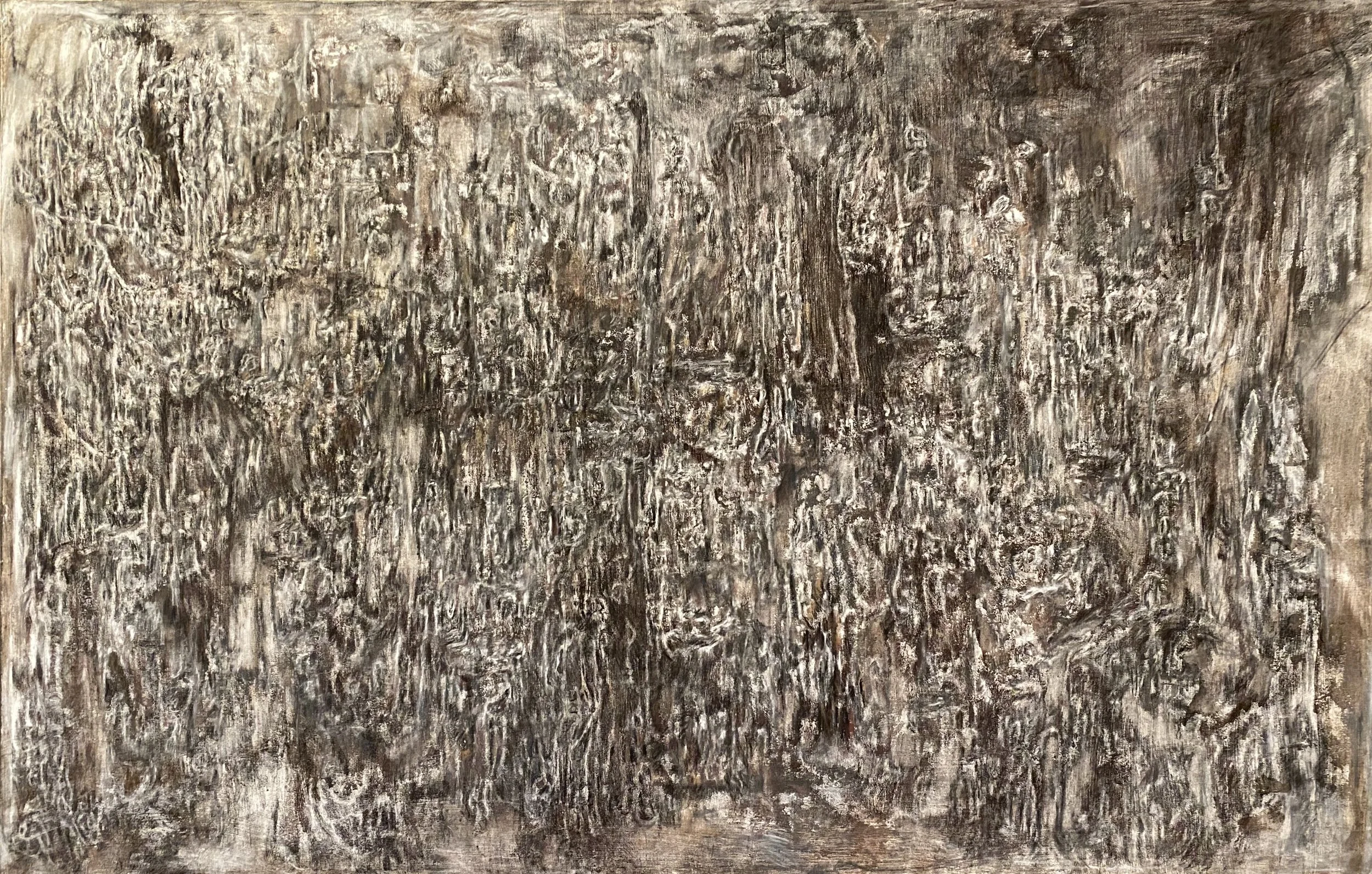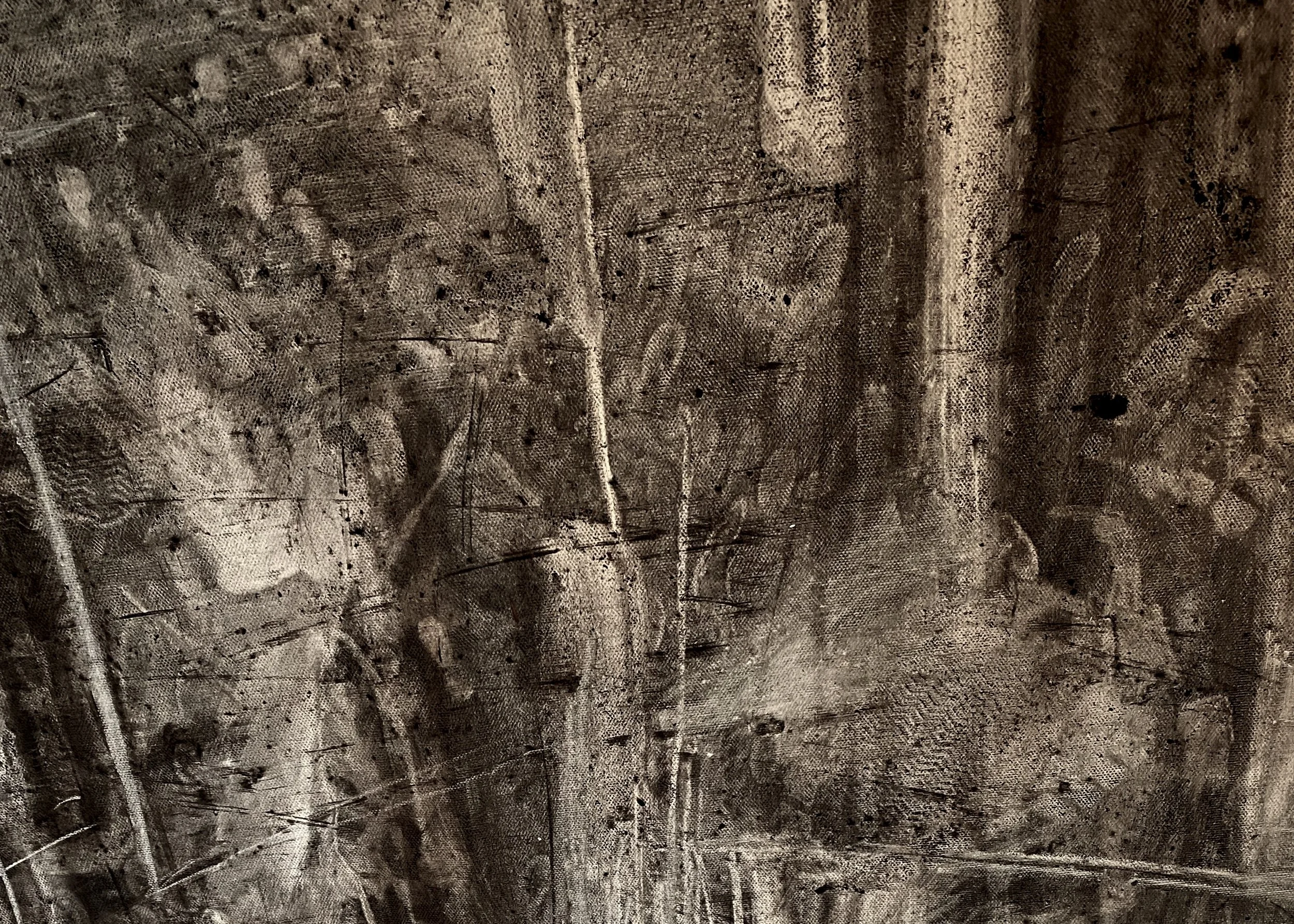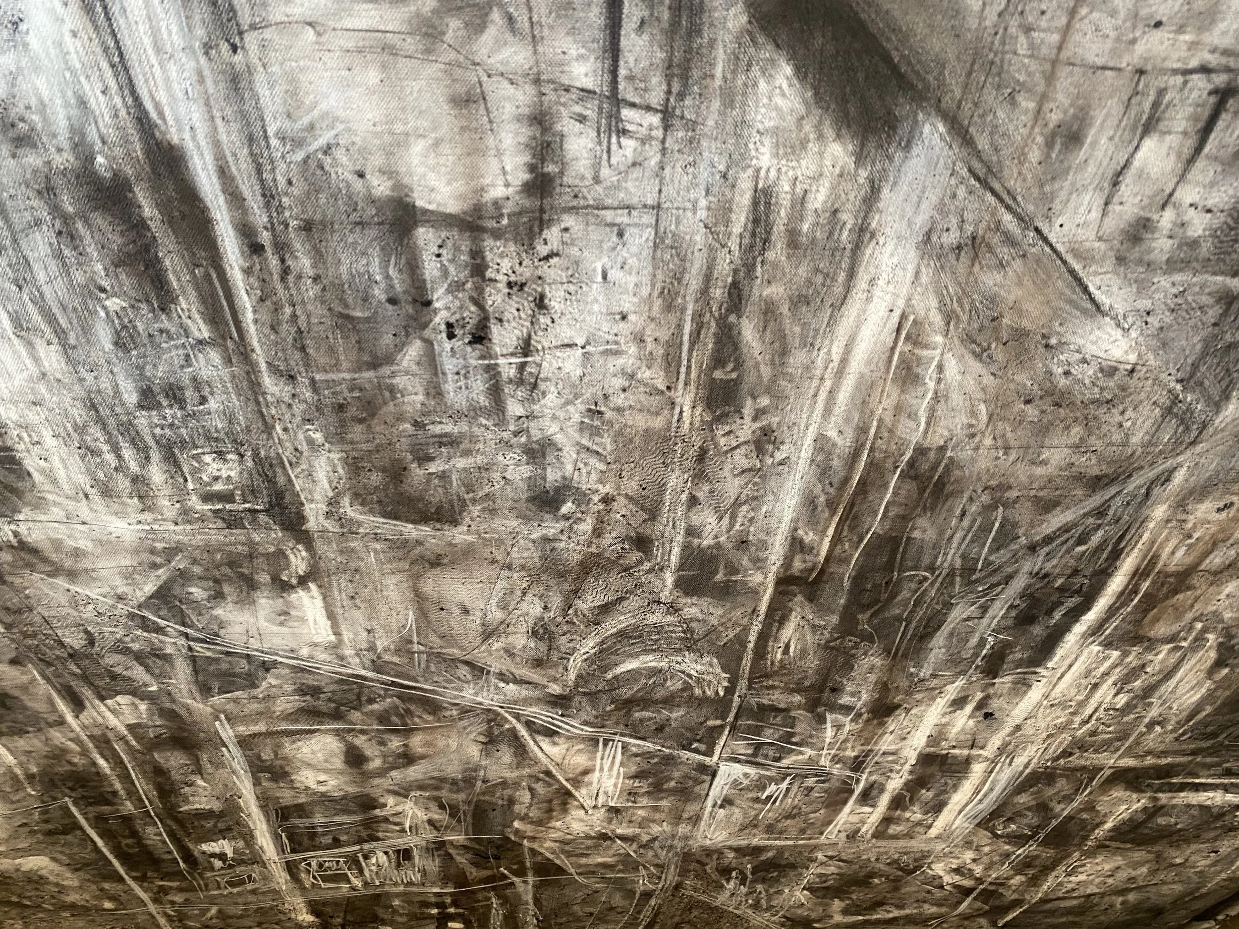 Charcoal, brick dust, powdered marble, pastel, rust, and chalk on canvas.