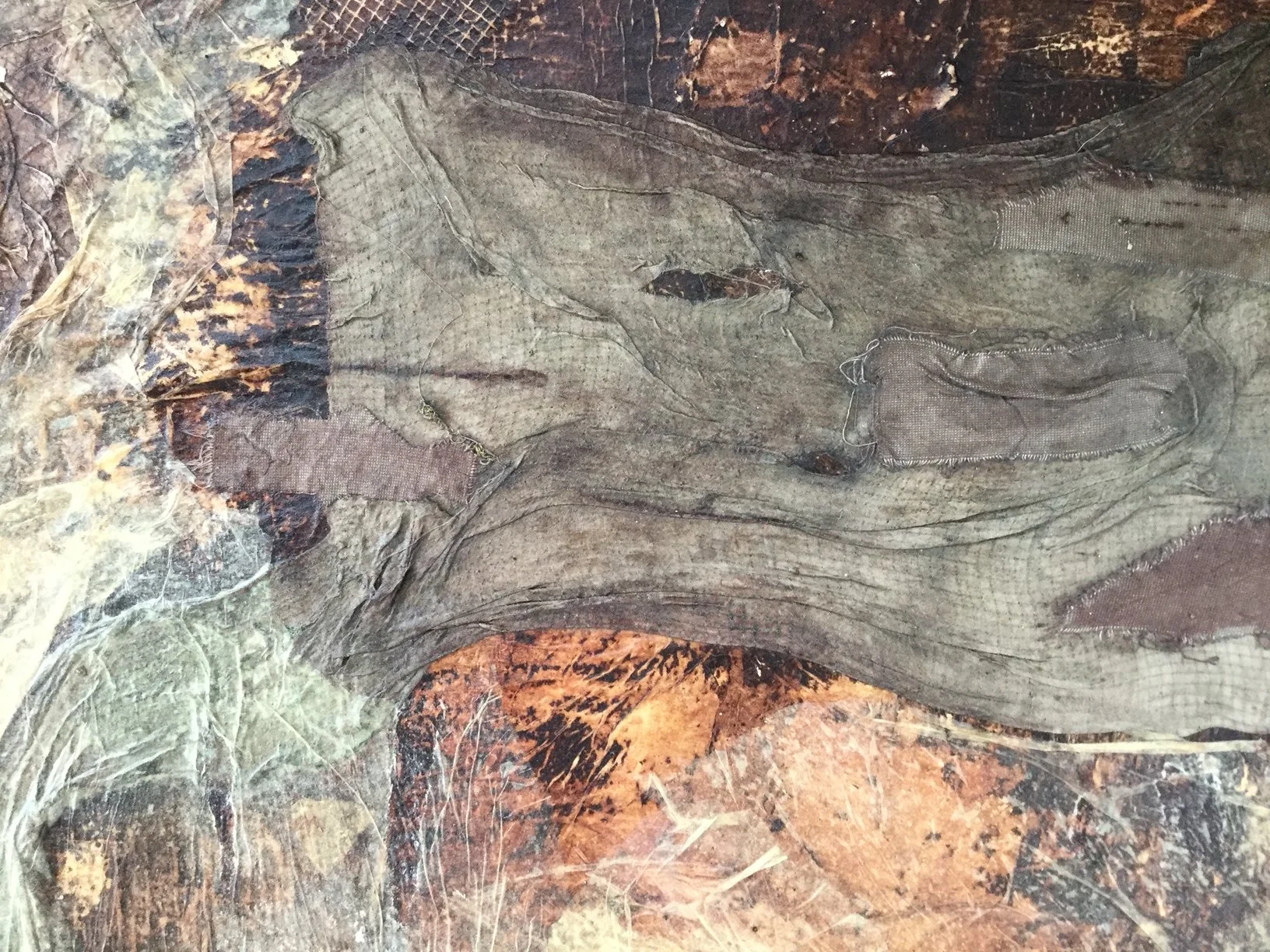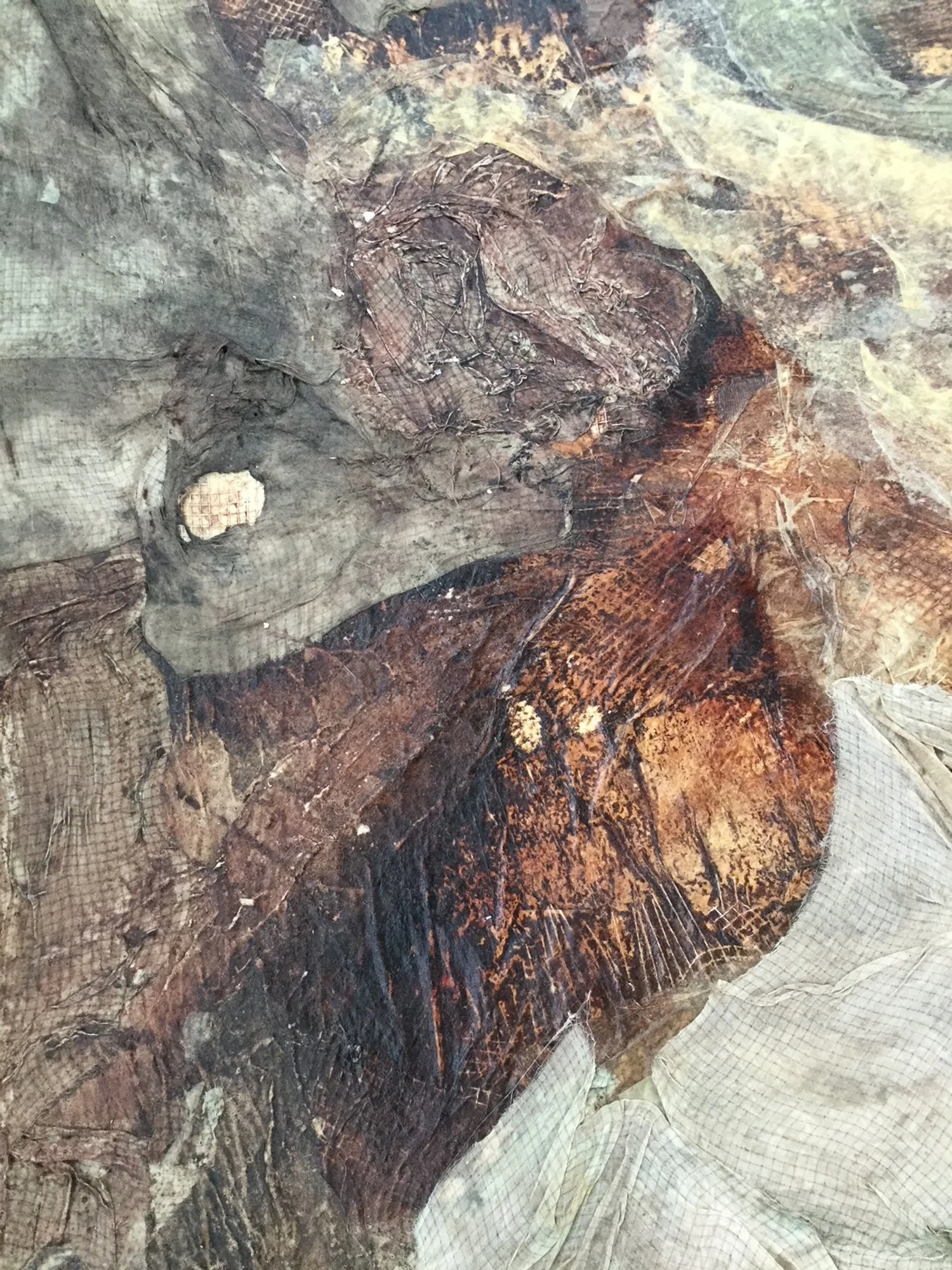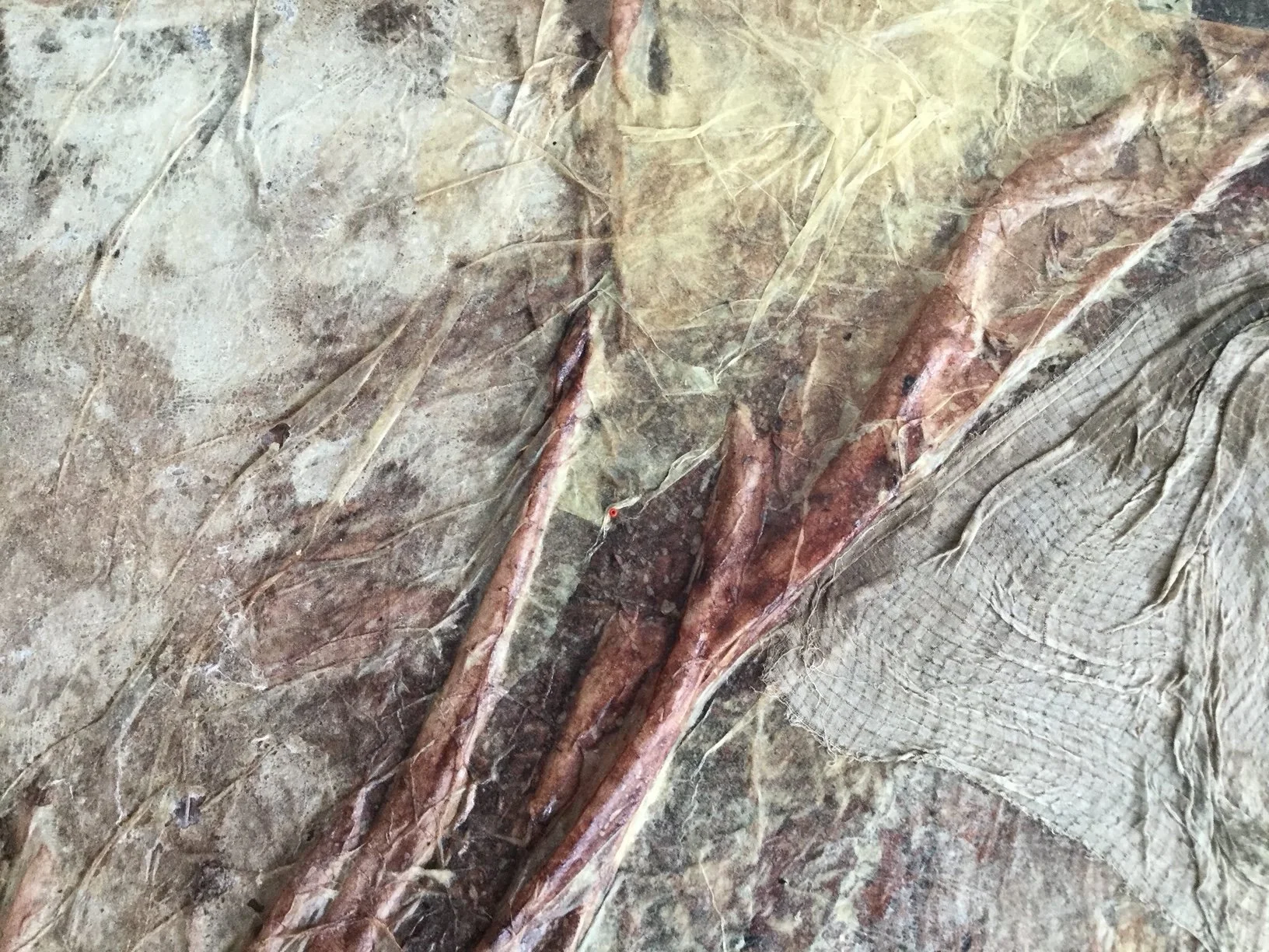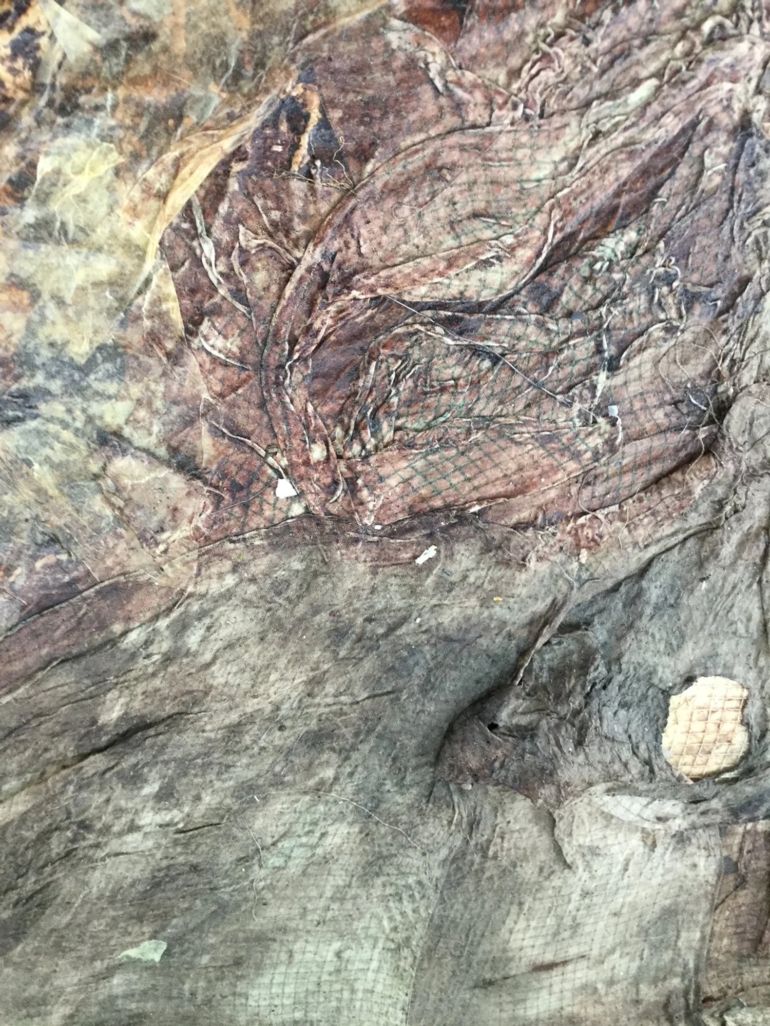 fabric, paper, mesh, drywall tape, rice glue, avocado pit ink, walnut ink, sugar, and salt on compound board 36”x 36”