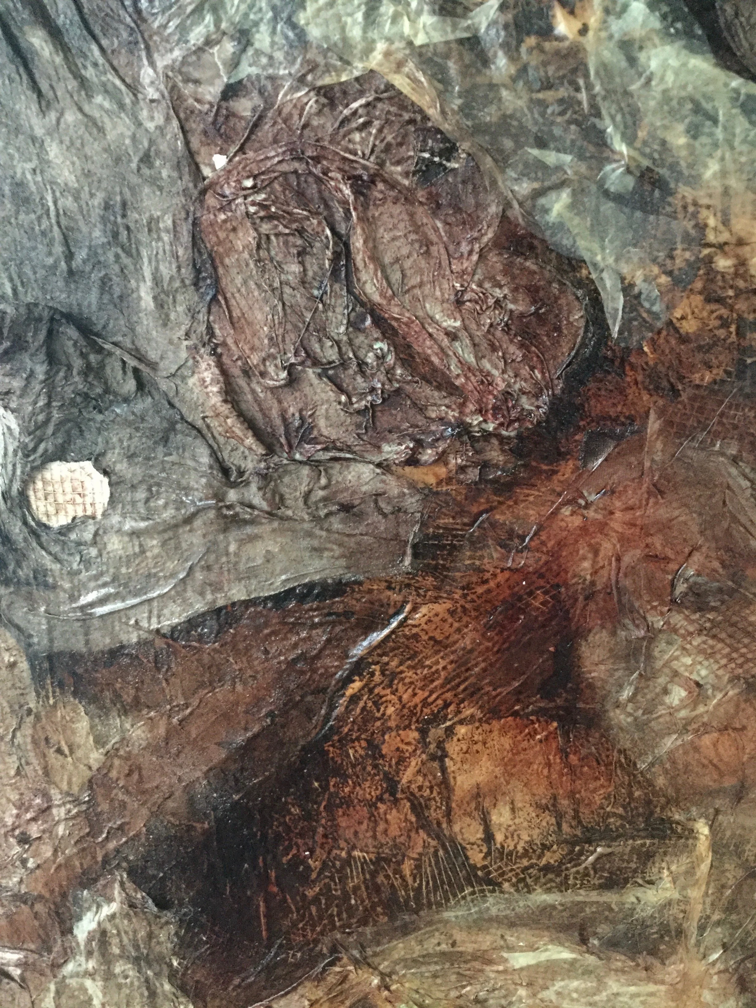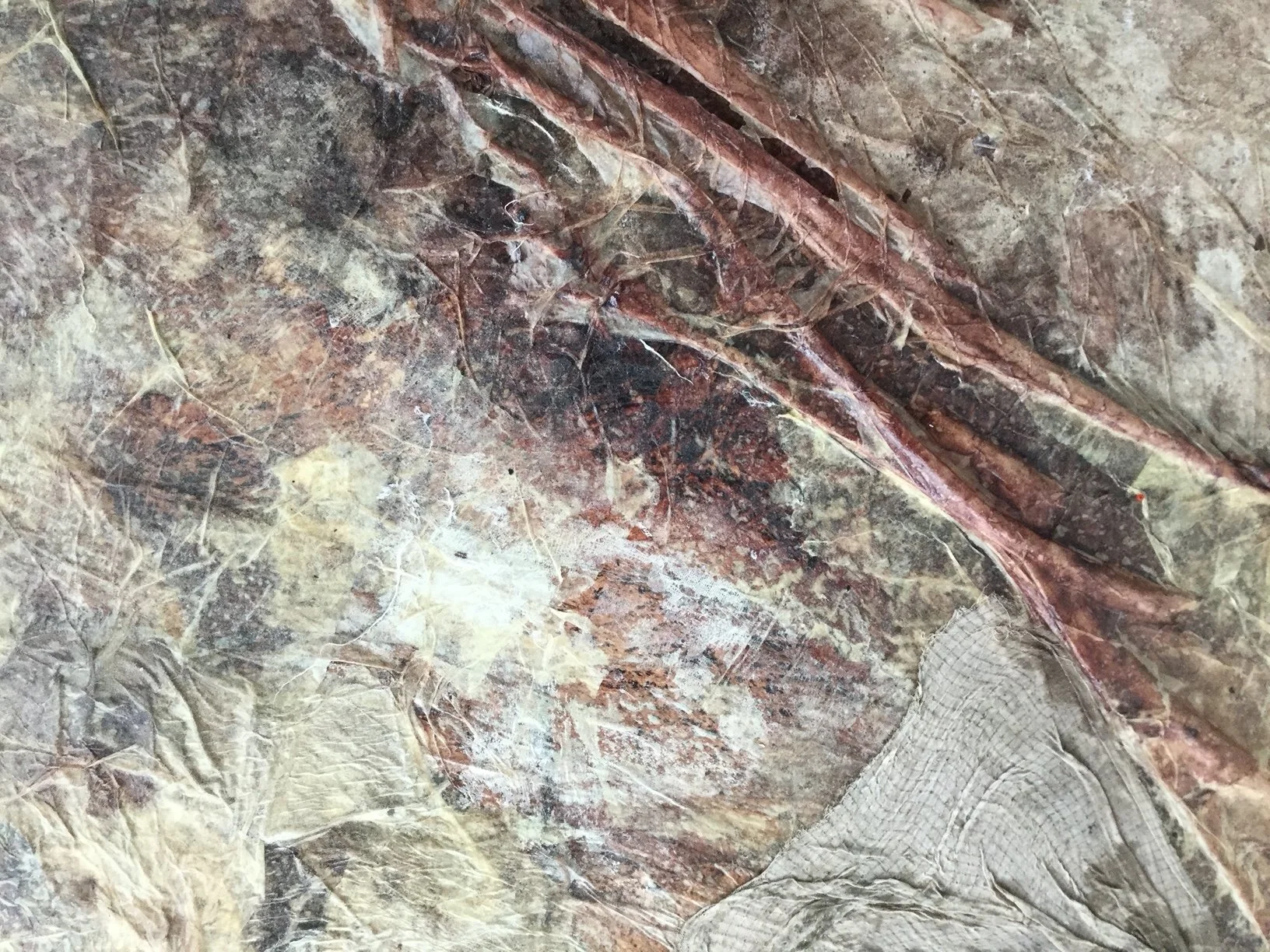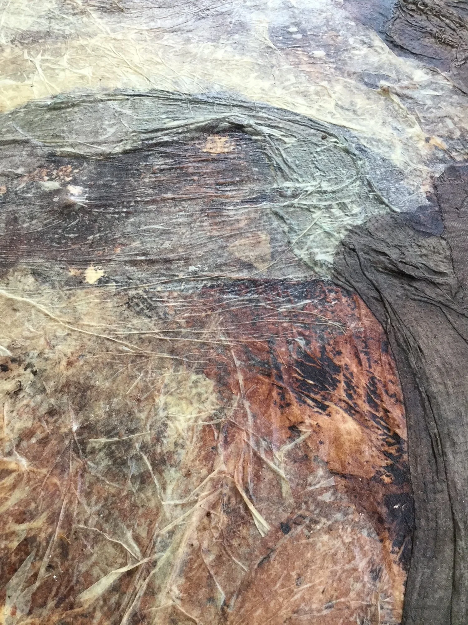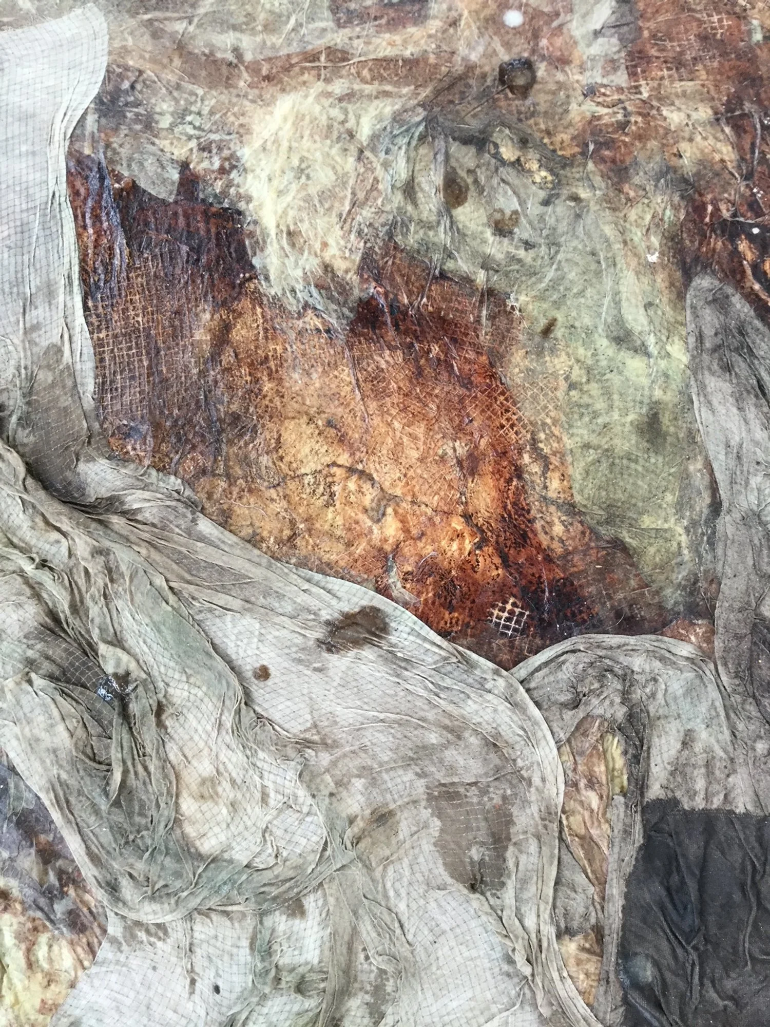 fabric, paper, mesh, drywall tape, rice glue, avocado pit ink, walnut ink, sugar, and salt on compound board 36”x 36”
