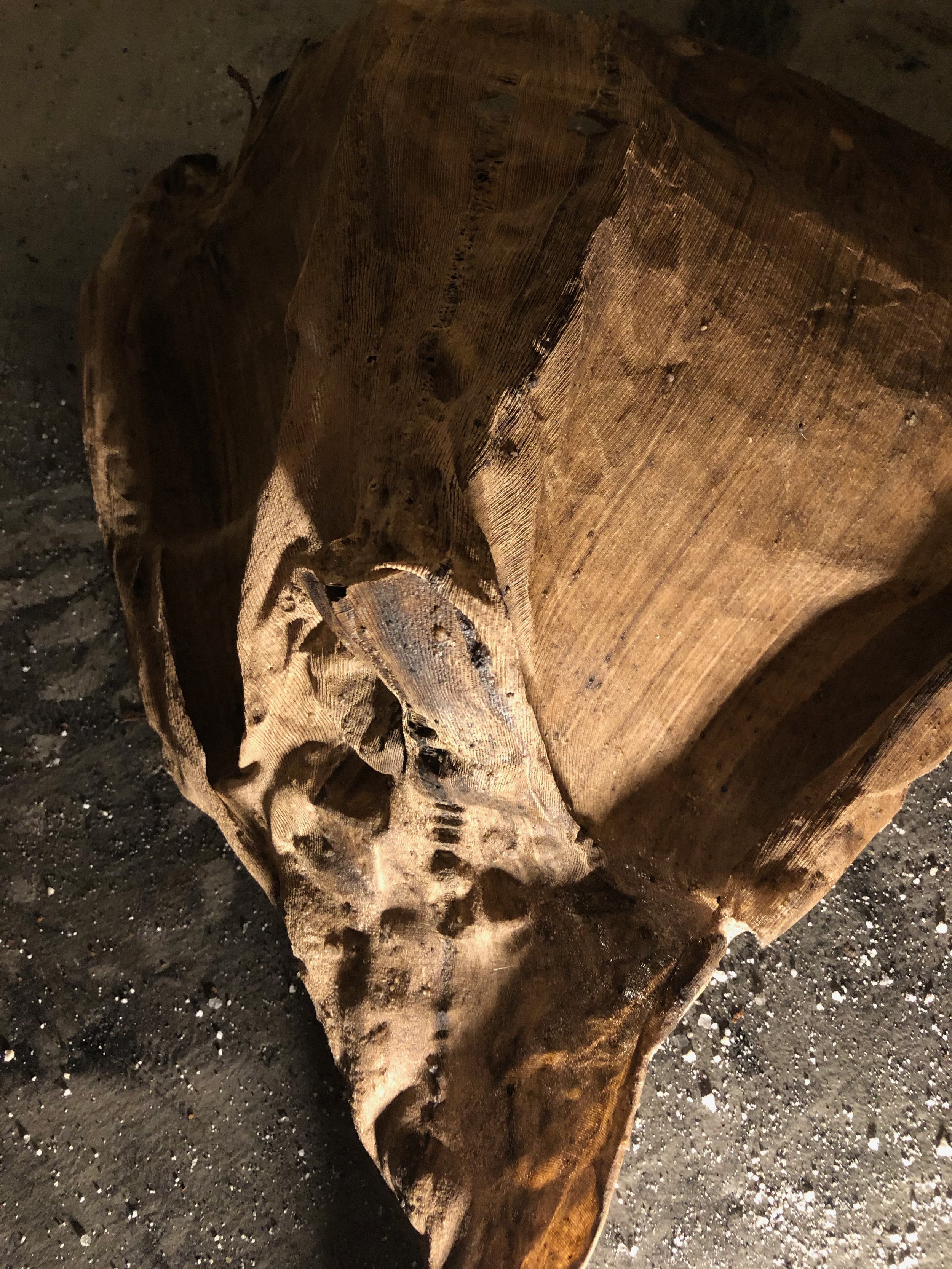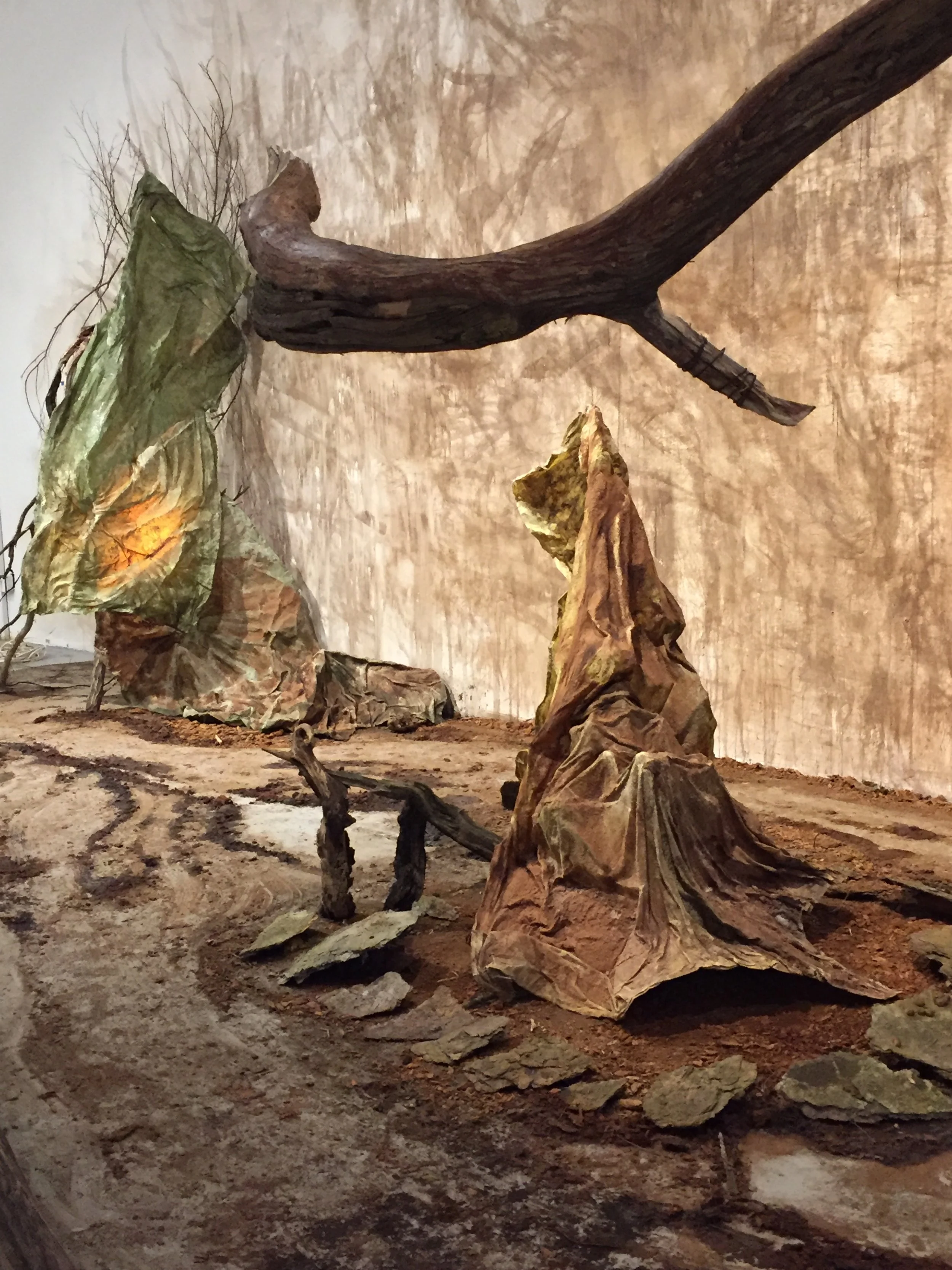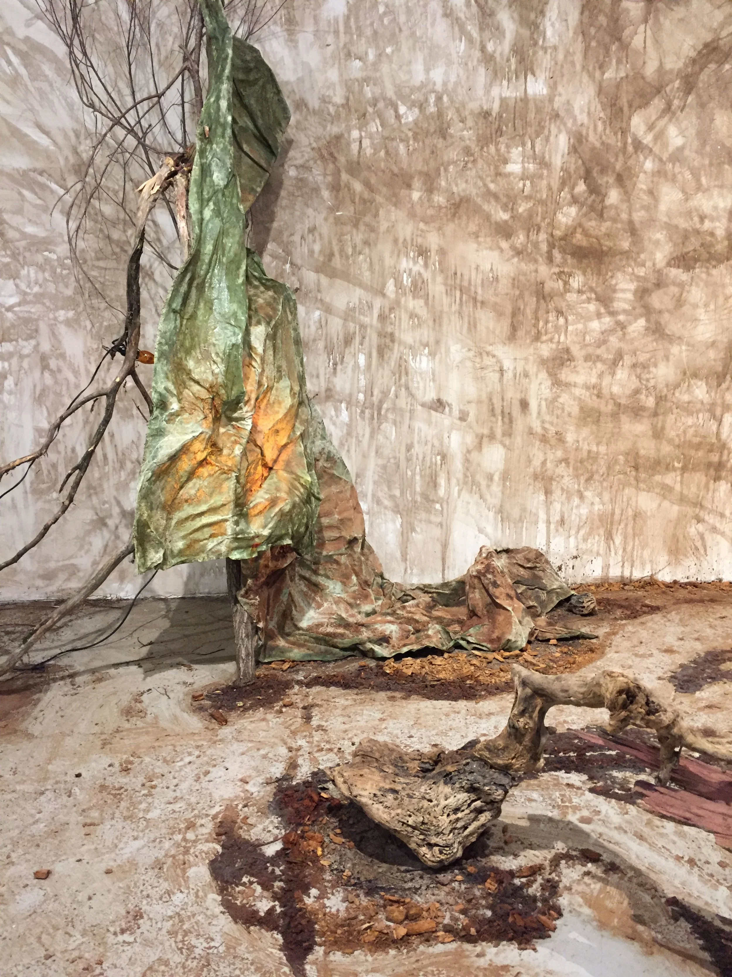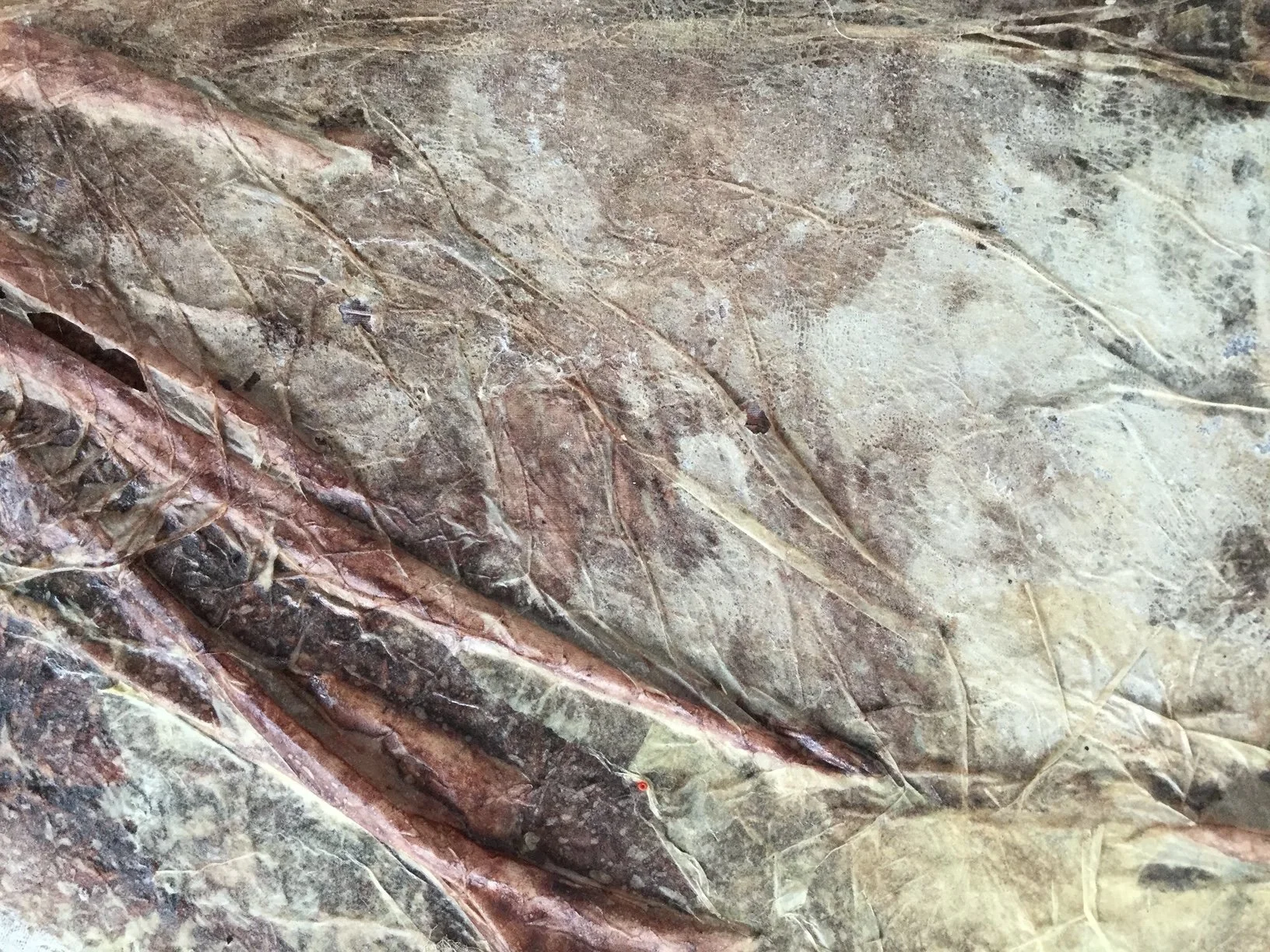 fabric, paper, mesh, drywall tape, rice glue, avocado pit ink, walnut ink, sugar, and salt on compound board 36”x 36”