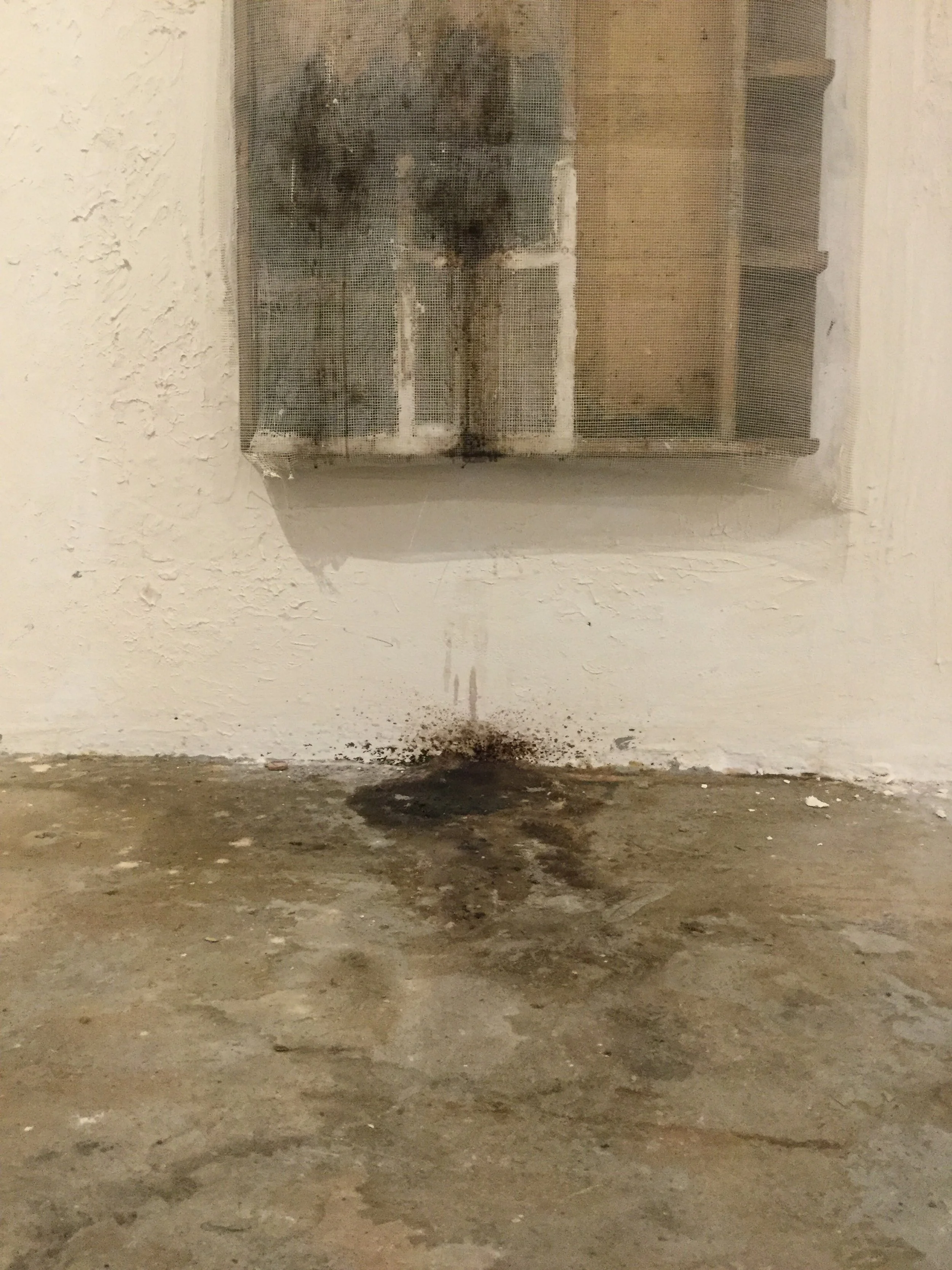 Dirt, tea, turmeric, walnut ink, salt, rust, rice, charcoal, text. Lit by single “dipped” bulb hung 5” off the floor. Sound: recording of breath from mic on throat. Scent: mixture of oils infused in room.