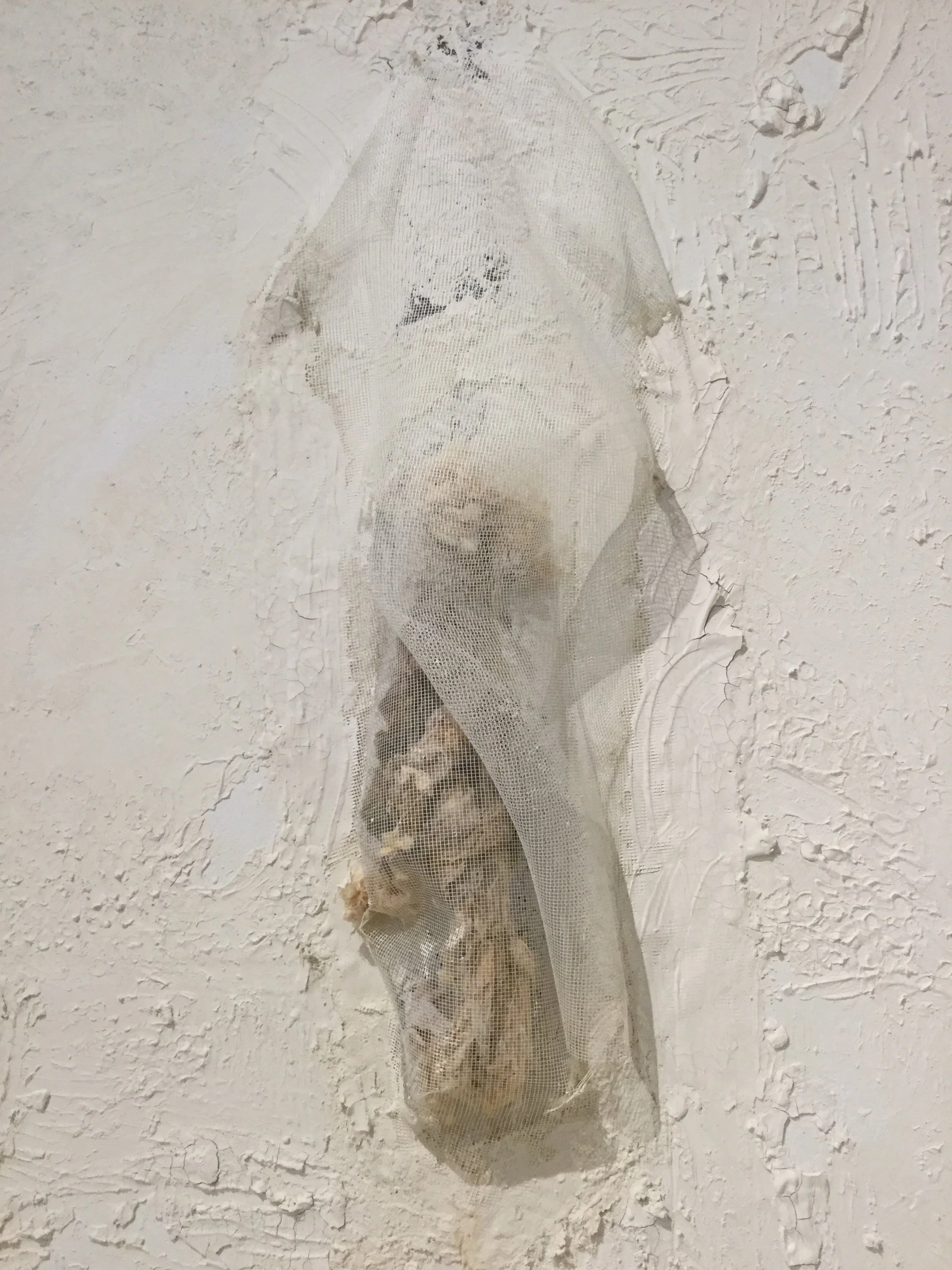 diatomaceous earth, fabric, drywall tape, cotton, found materials, rust, salt, black walnuts, ink, animal jawbone