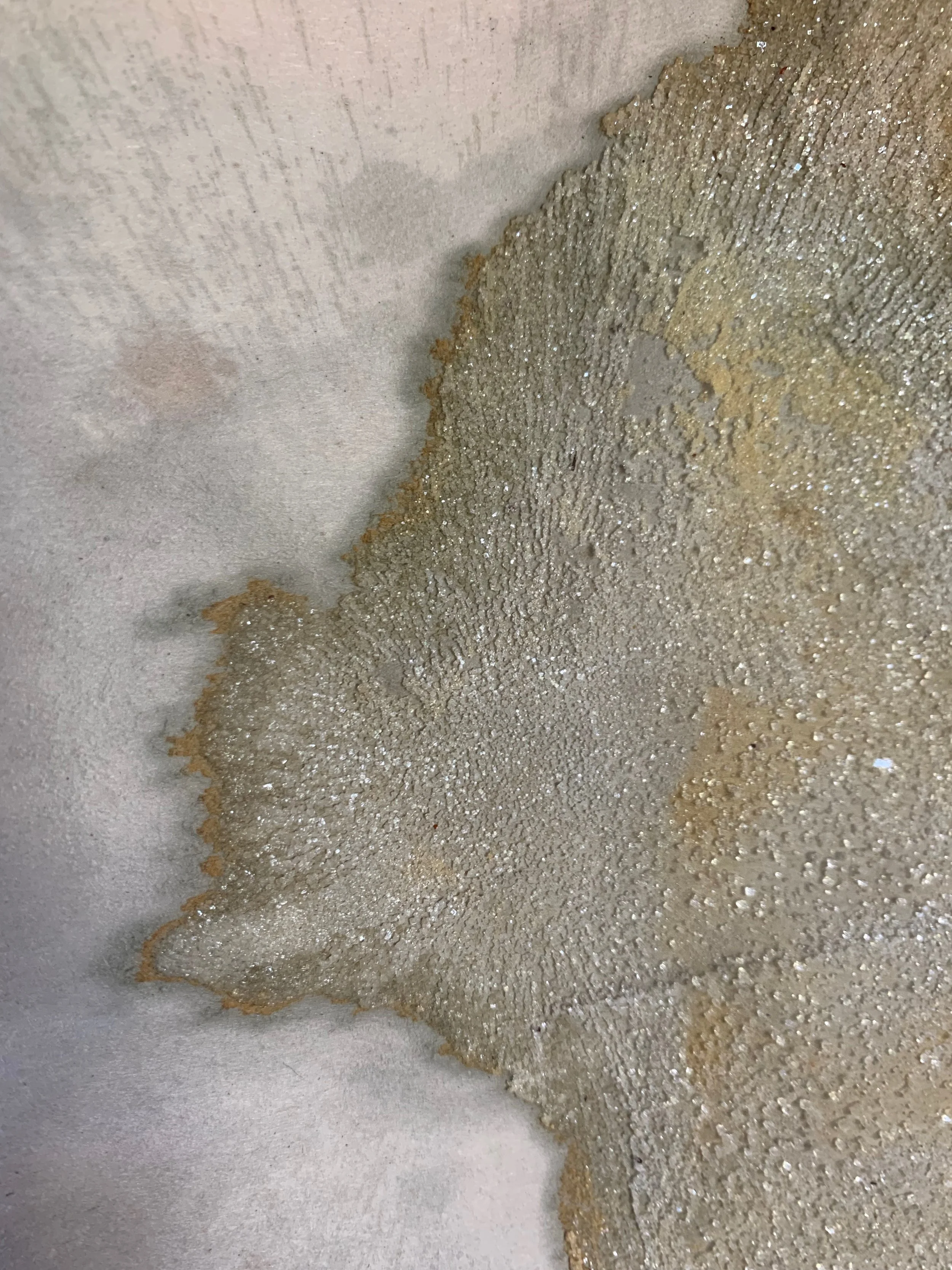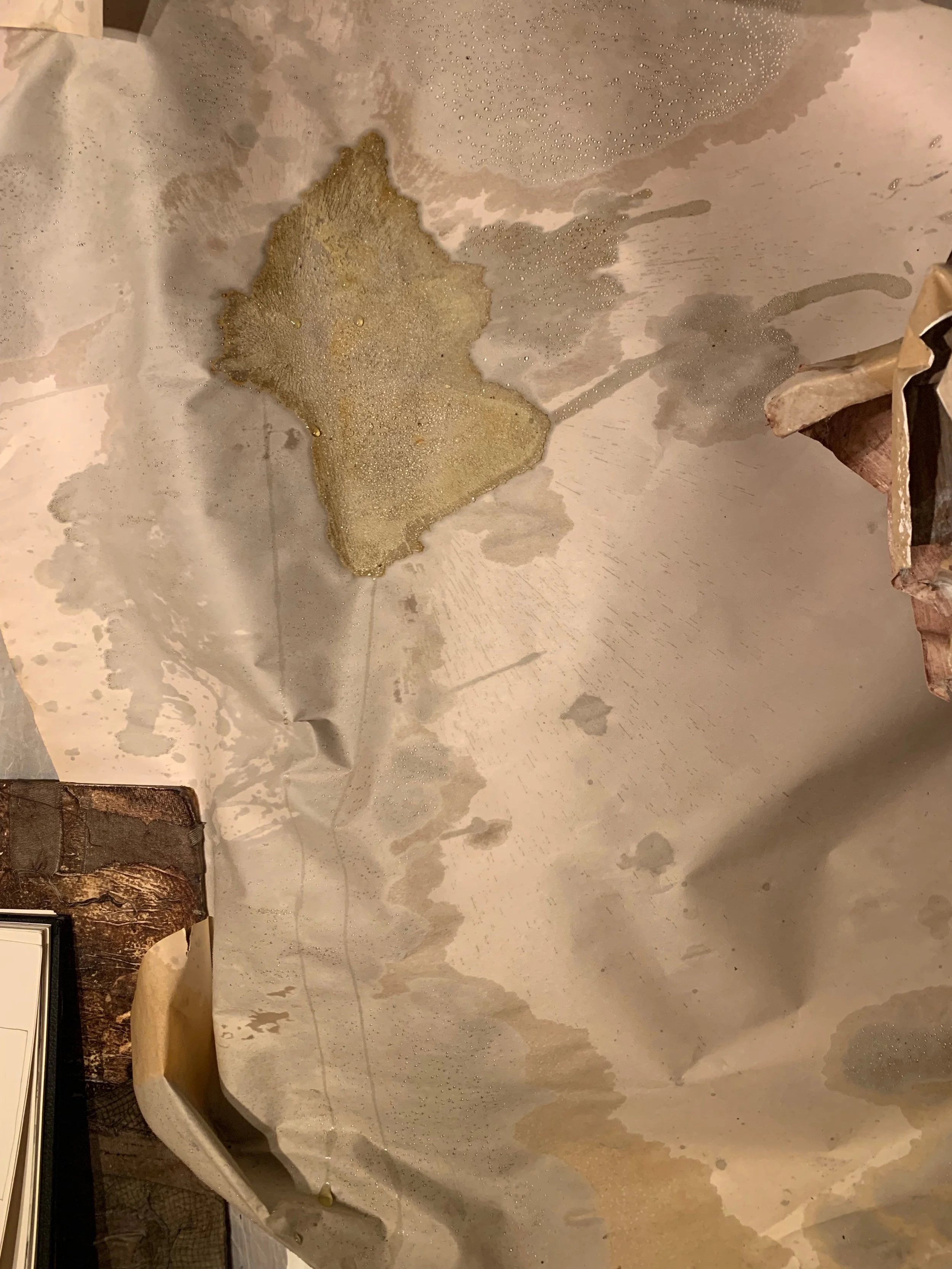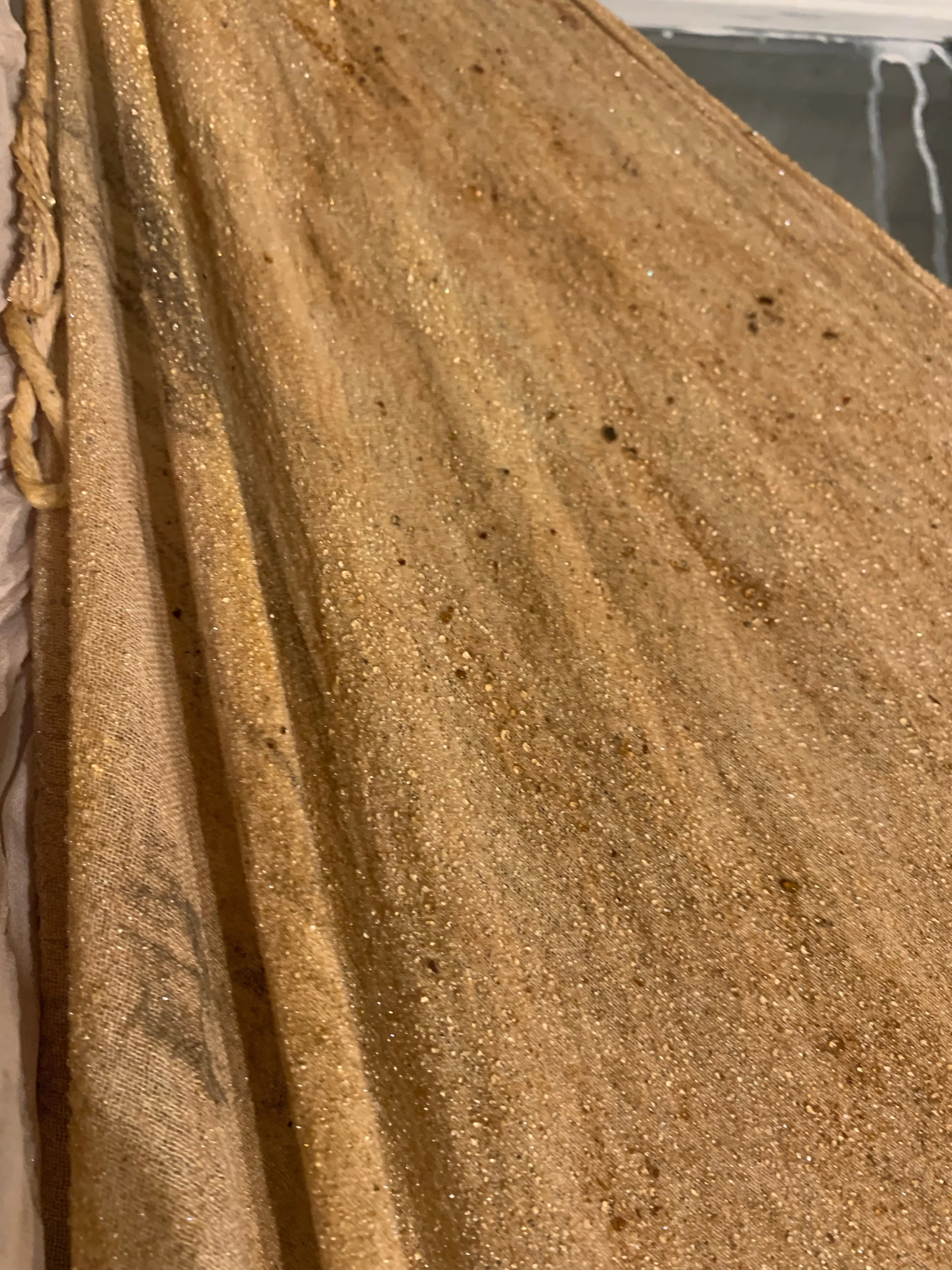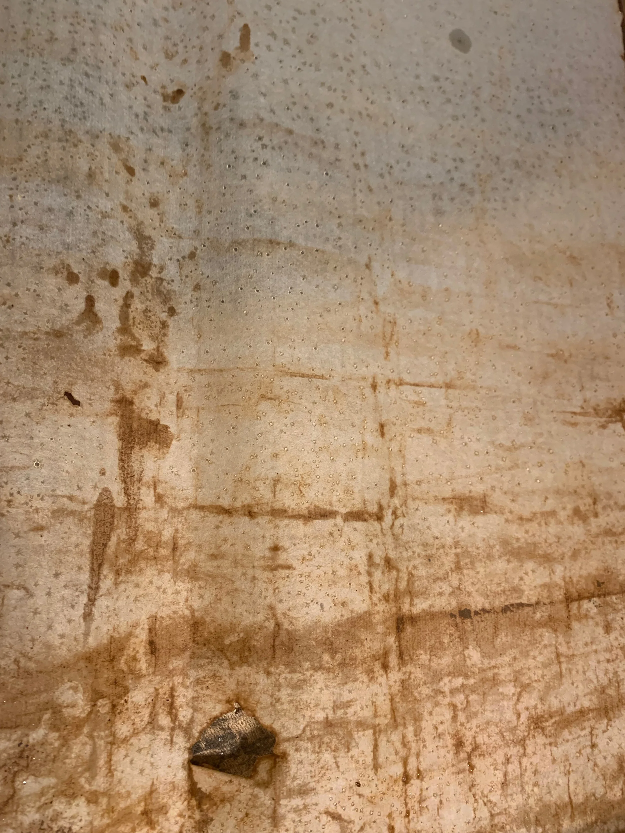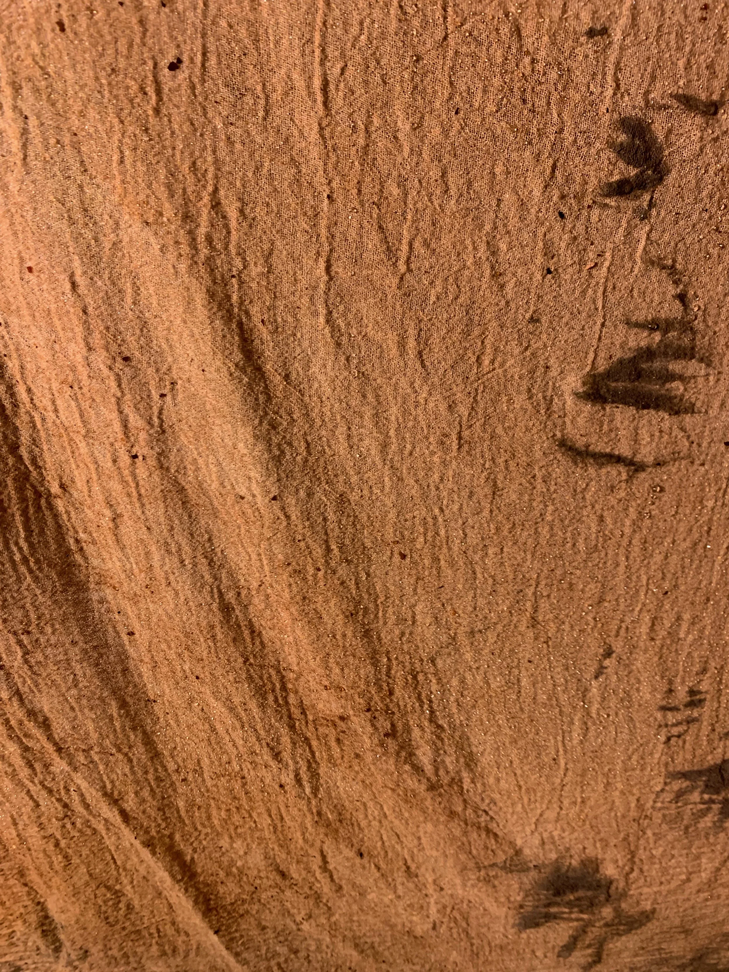 The images show fabric that has been soaked in liquid rust. The rust “ink” has a very high salinity. When the materials dry, they have a slightly textured surface.