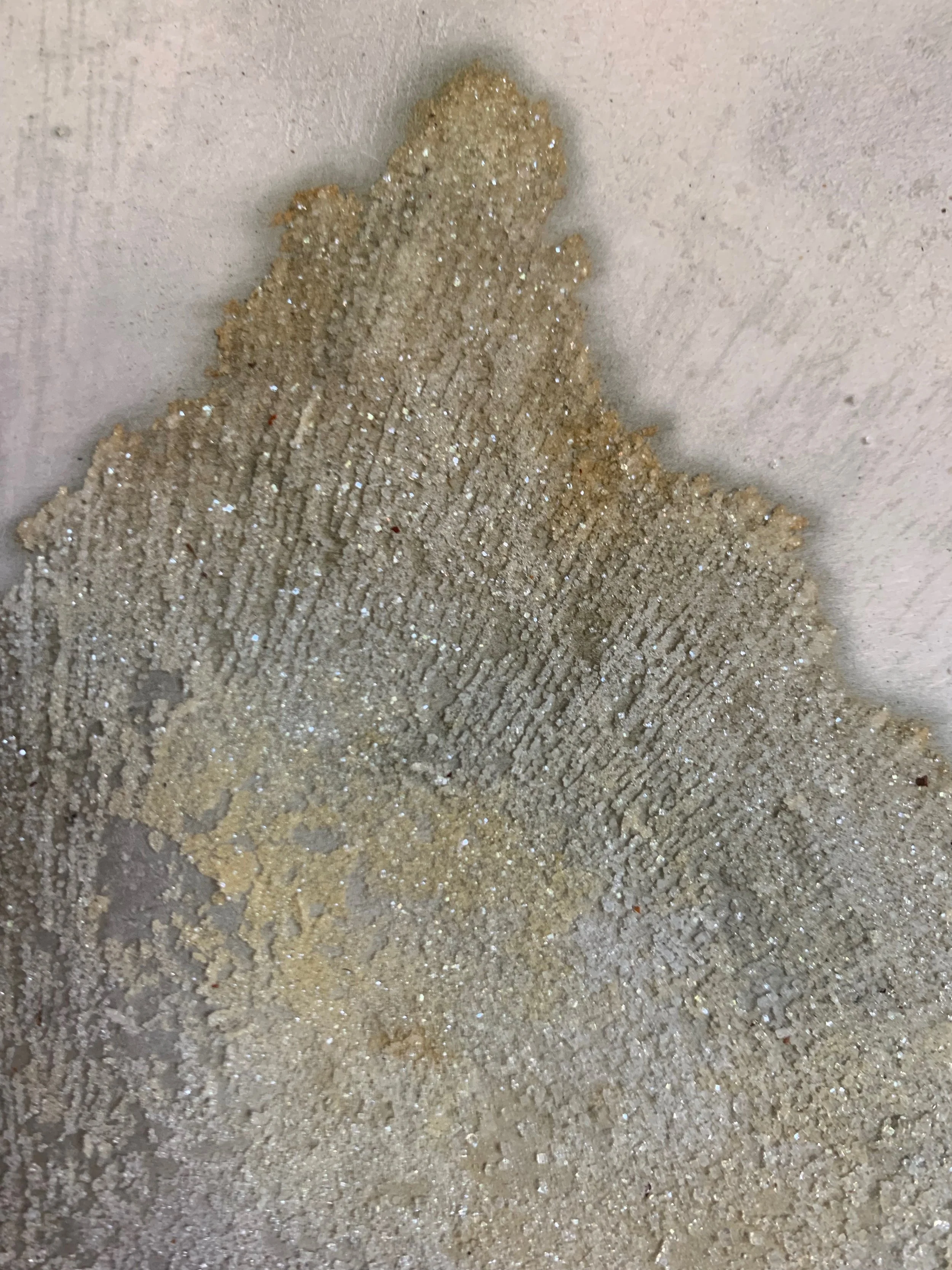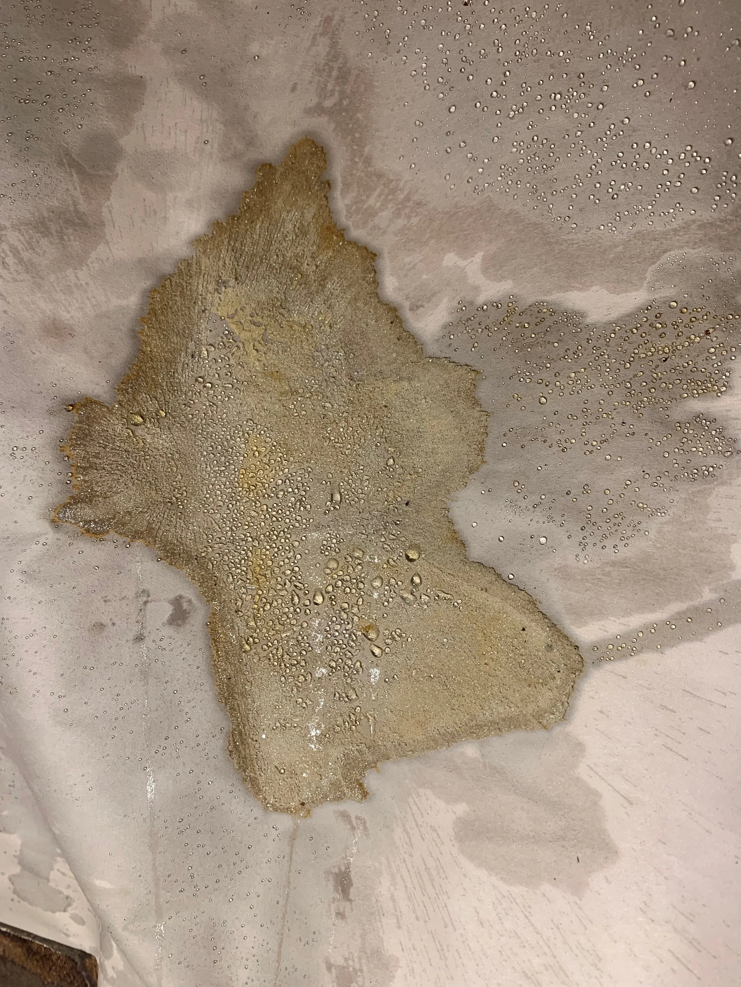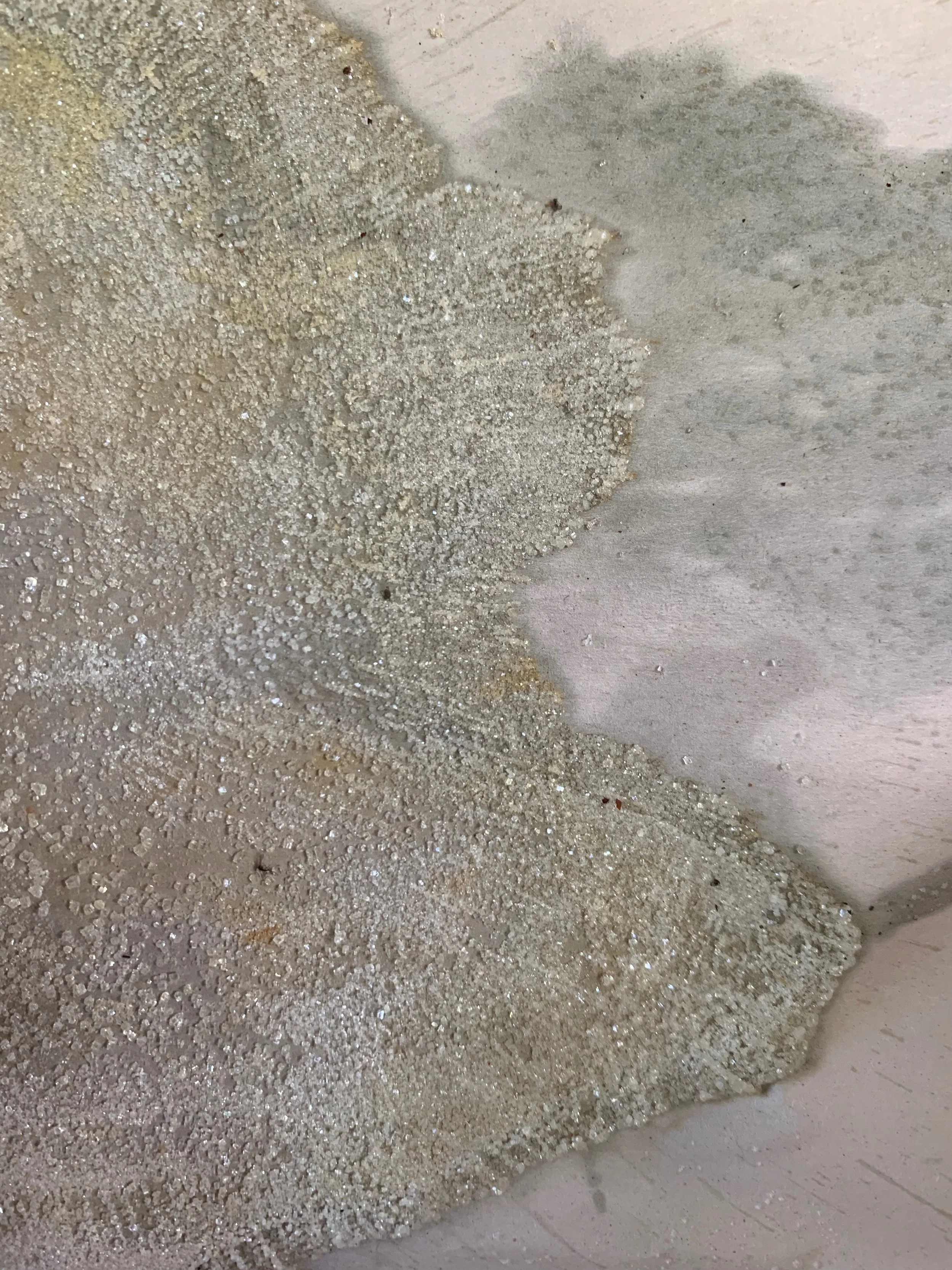 In high humidity, the fabric draws in moisture from the air. Water beads on the surface and eventually “weeps” down onto the paper below. As humidity decreases, the paper dries revealing a pattern of crystalline salt, stained with the rust from the fabric. As humidity rises again, the paper itself begins to weep.
