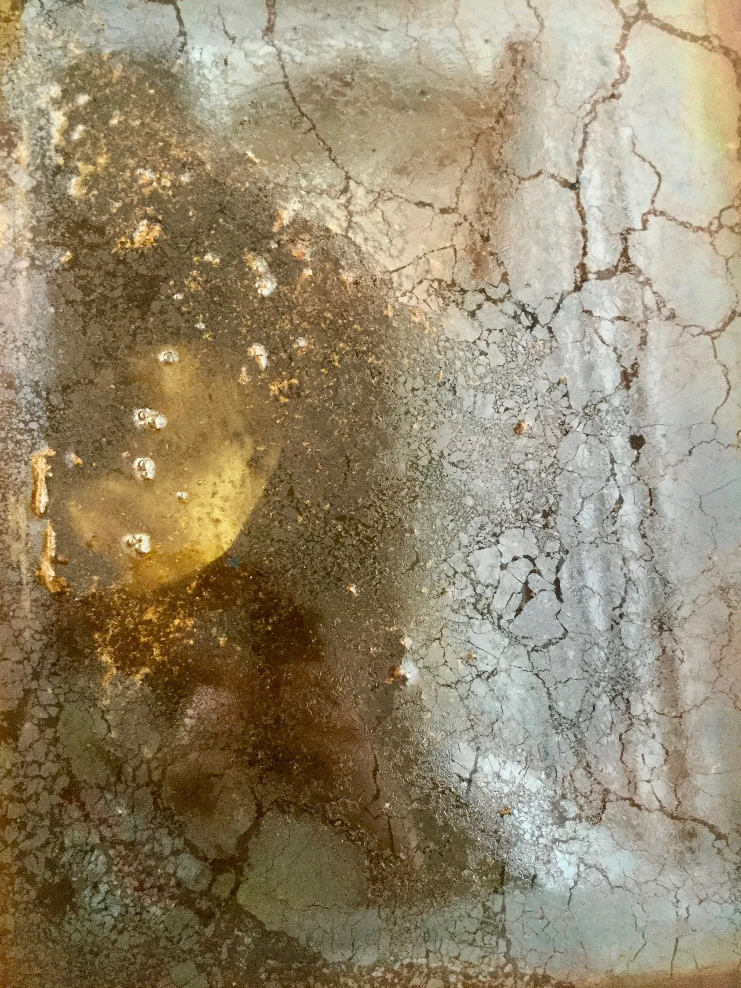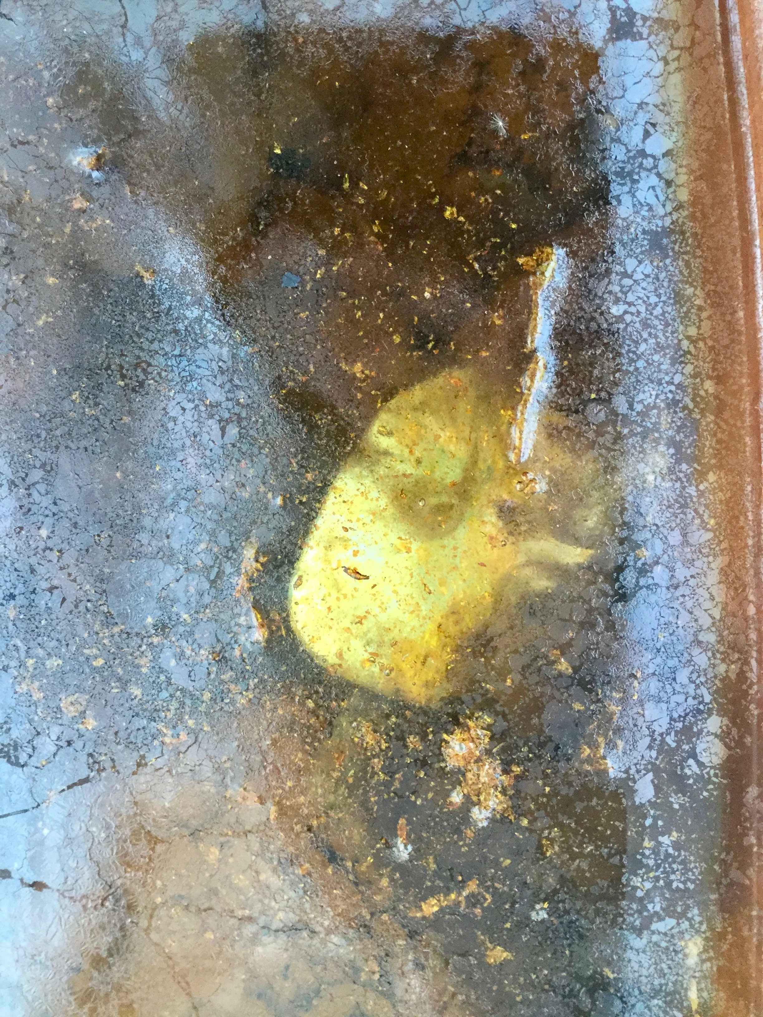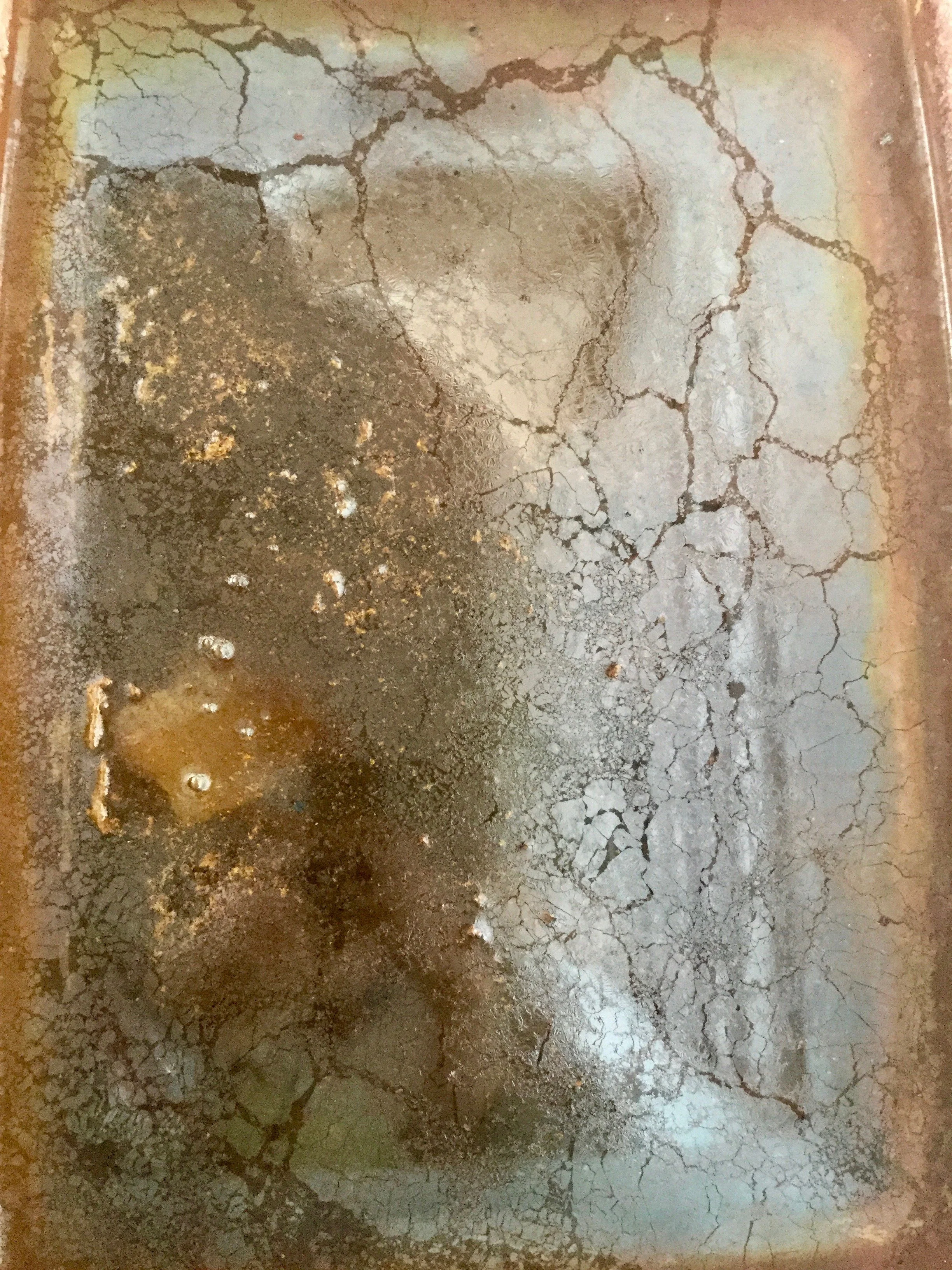 Rust, salt, metal fragments, mirror, and glass in water Aged 9 months